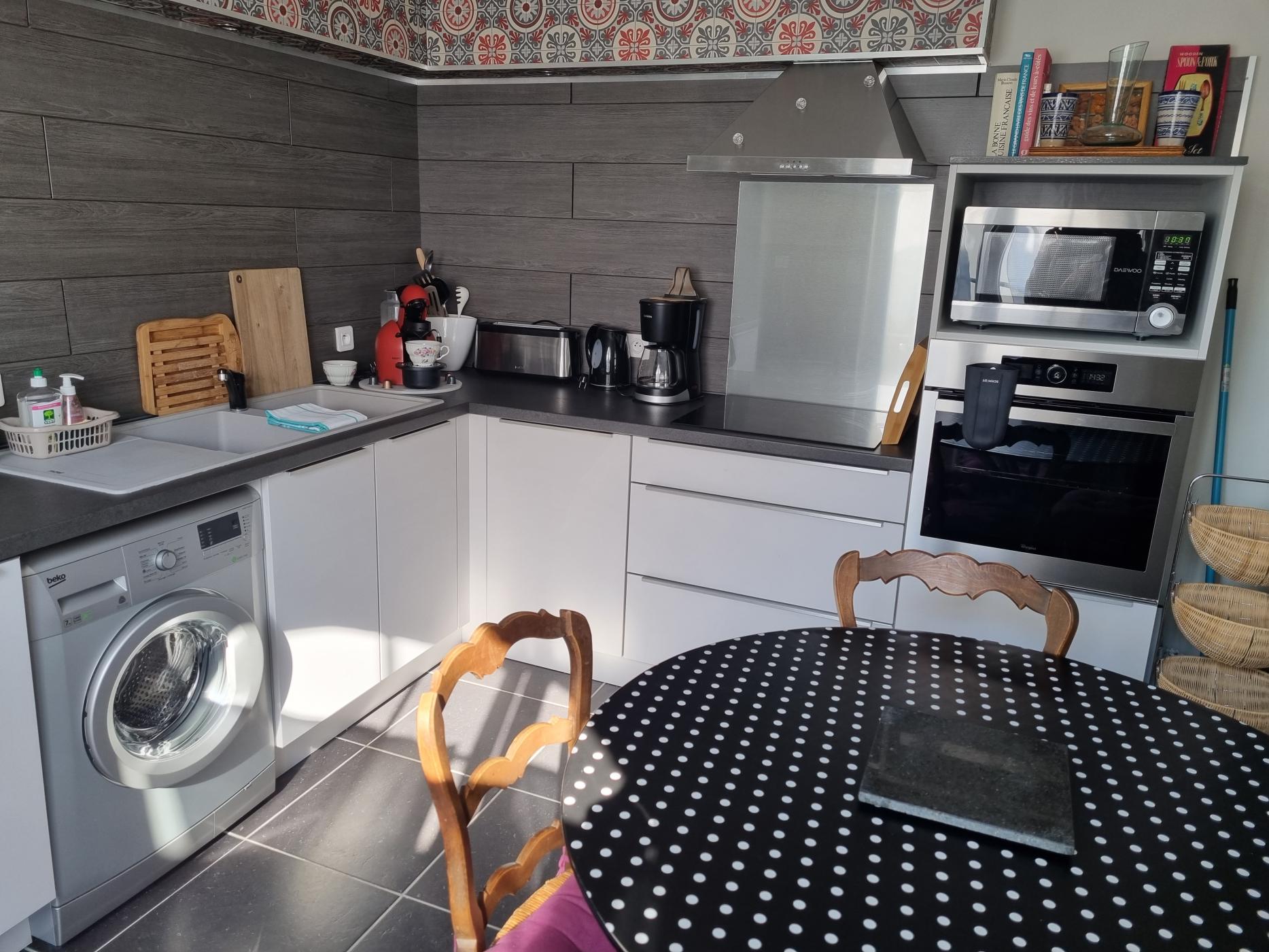 A l'arrière, une adorable petite maison blanche de plein-pied peut encore accueillir 4 personnes : 1 CH avec lit double 160 et 1 CH/salon avec 1 canapé convertible BZ pour un couchage en 140, séparées par le coin repas privatif et une salle de bain avec douche et WC